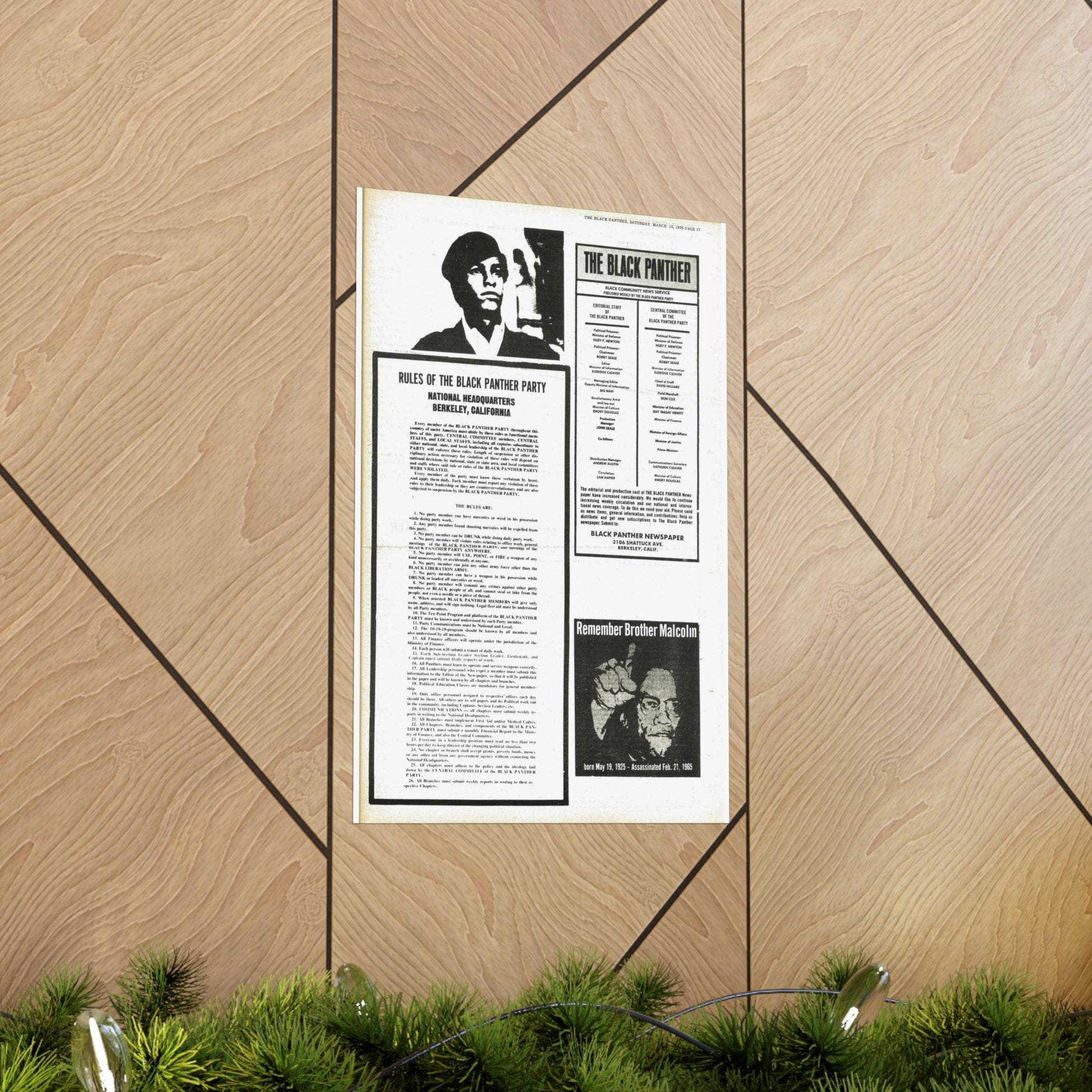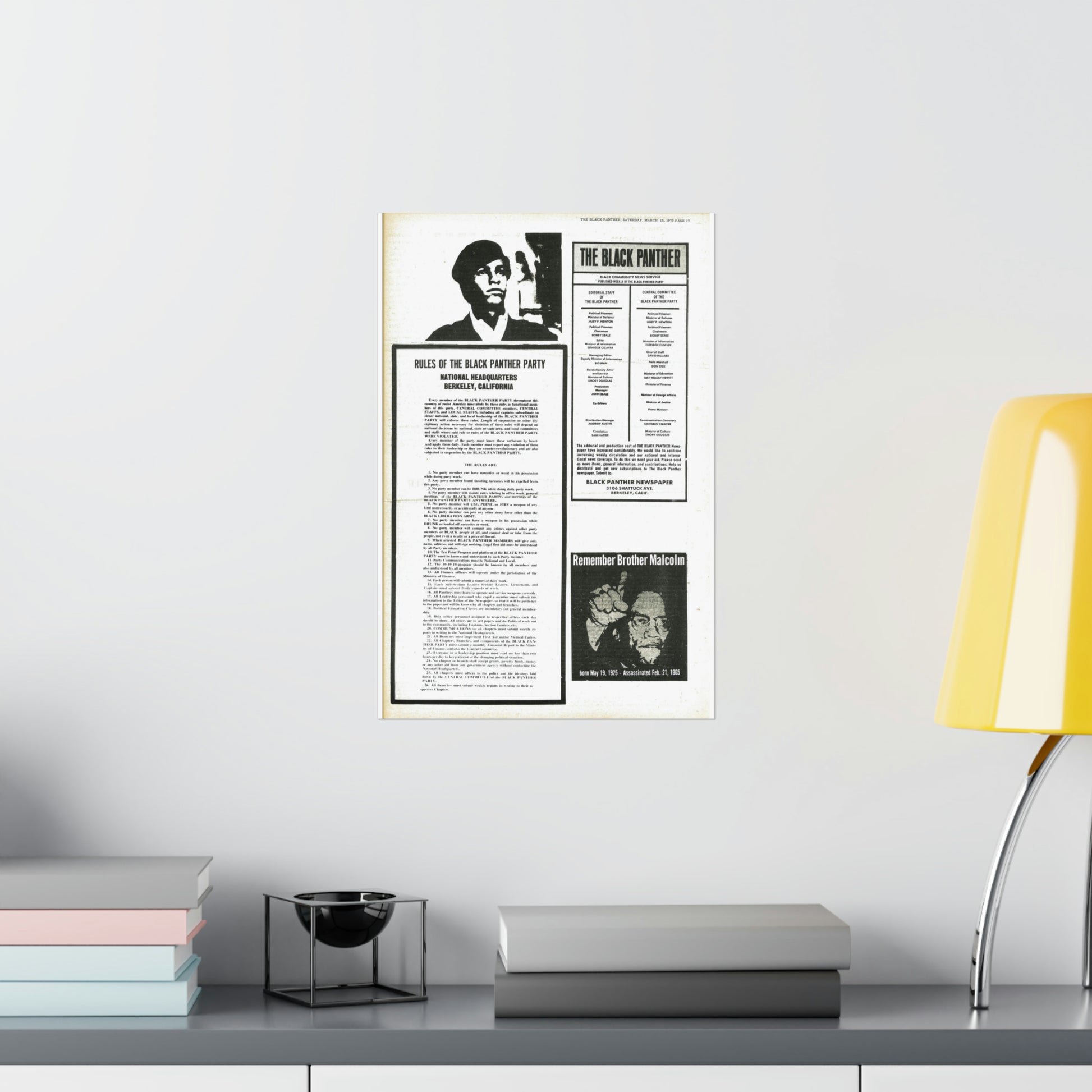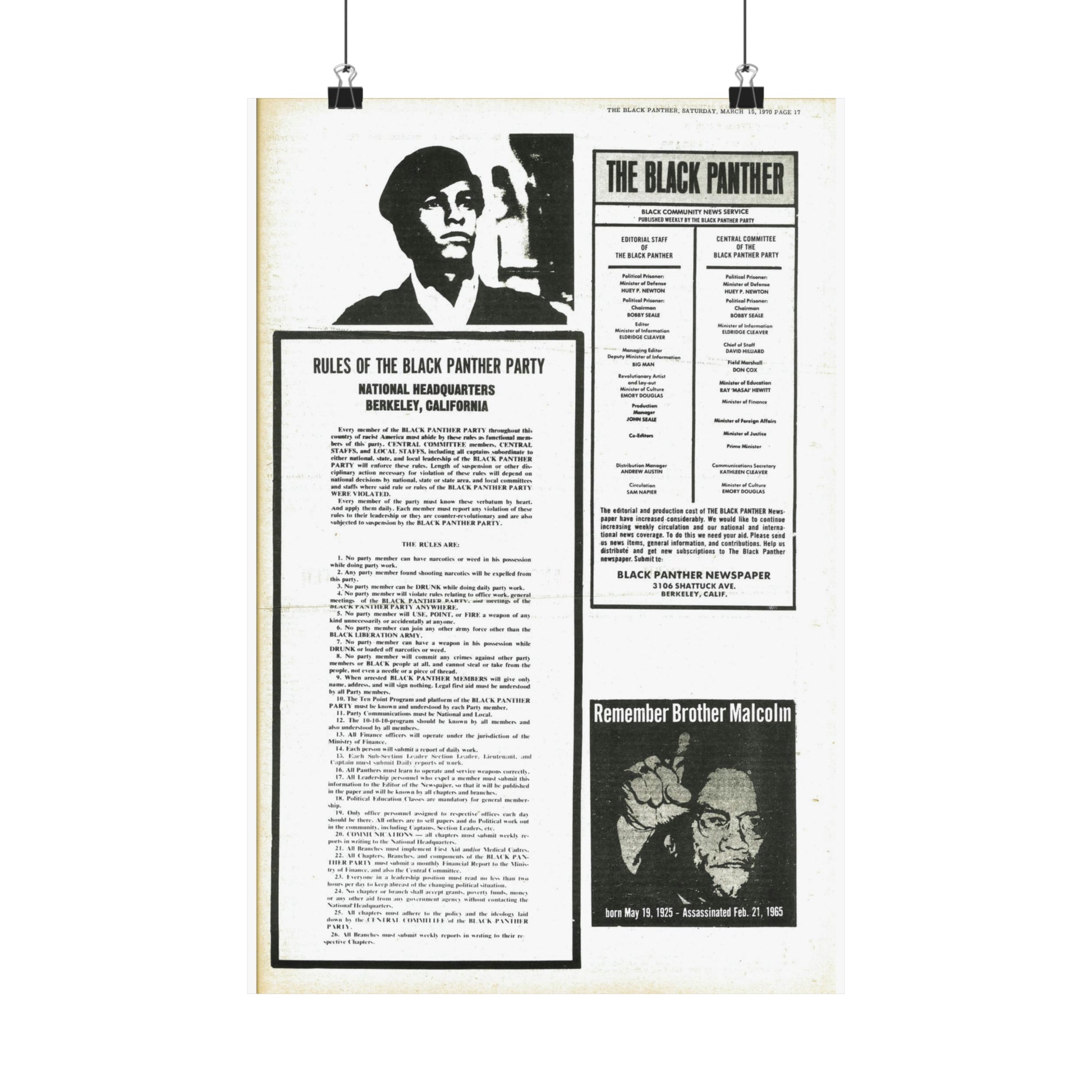 This poster is a reproduction of the cover of a 1970s Black Panther Political Party Poster. Founded after the death of MLK, the Black Panther Political Party fought for Civil Rights all throughout the country, primarily from their base in Oakland California. The Black Panther Party was exremely strict on membership rules and code of conduct given the intense scrutiny they were facing.
