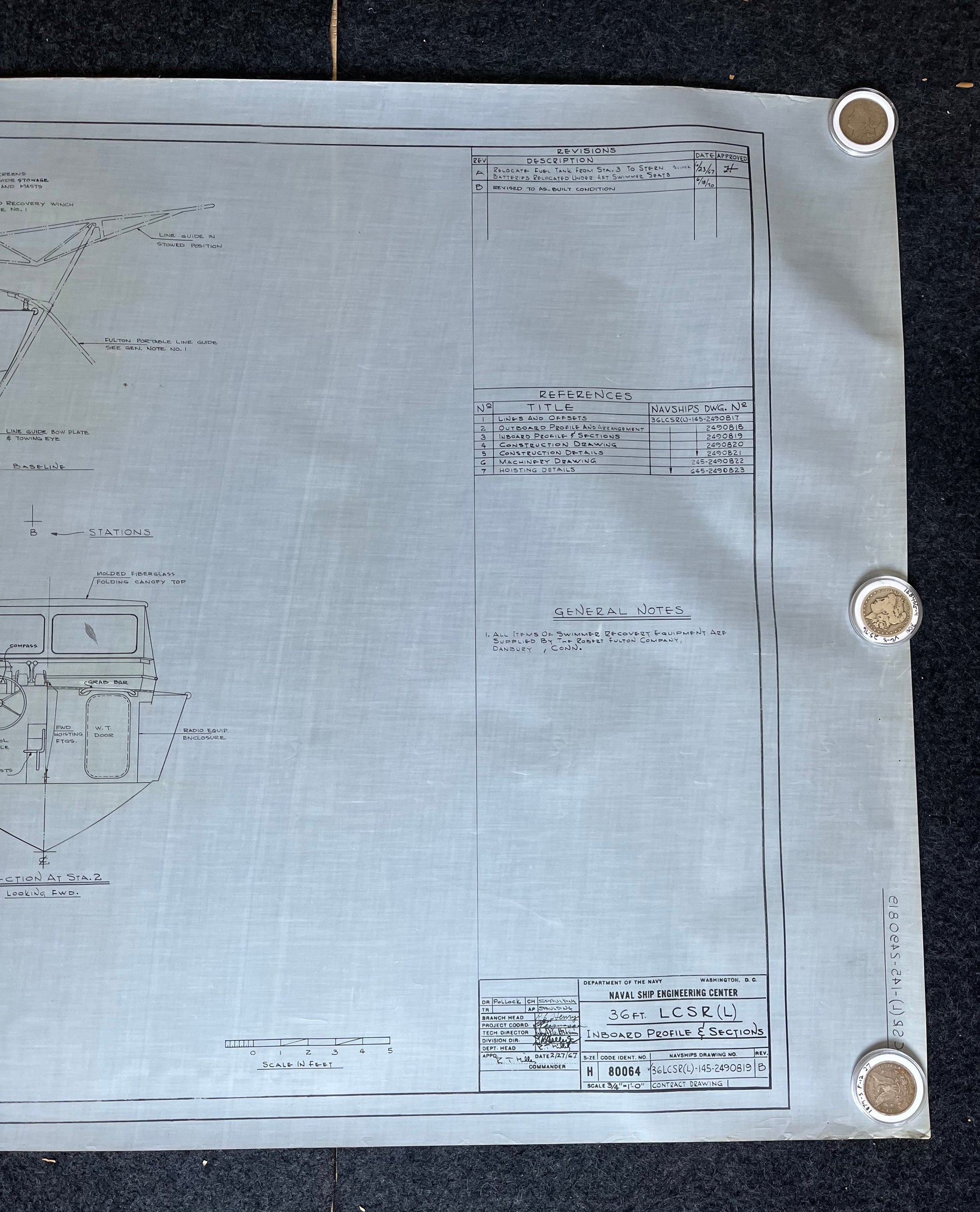 Description: You read it right! This is an original blueprint used by the United States Navy during the Vietnam War. It details the ship design of the LSCR - a 36 foot plastic swimmer Reconnaissance Landing Craft (LSCR) . This blueprint looks at the starboard and stern side of the LSCR boat.