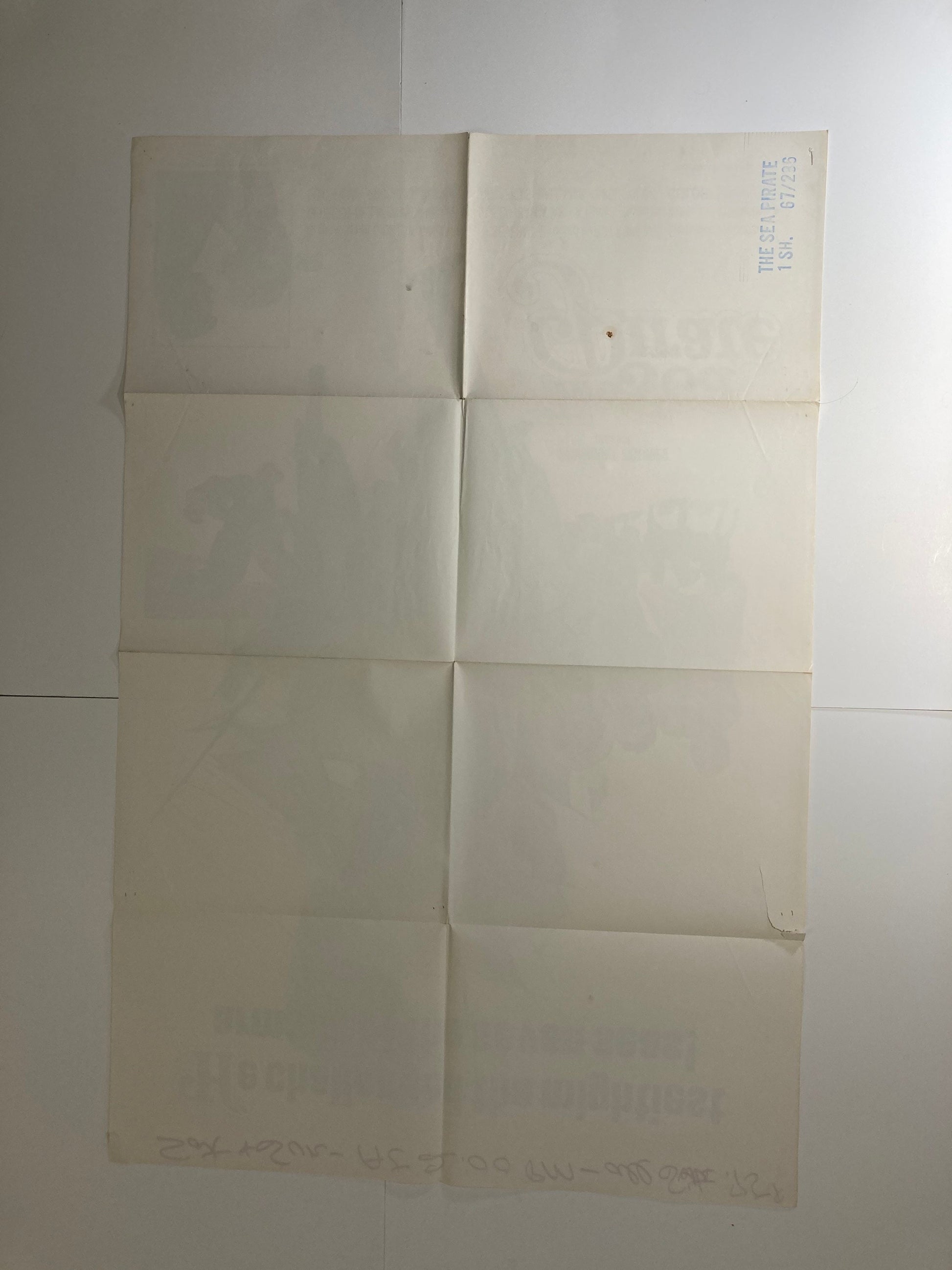 Condition: The poster is in okay condition. Tape stains and hand written dates are at the top where it was hung in a movie theater. There are 2 small tears wear the folds meet but these holes are invisible when the poster is laid flat. There is also a tear in the right side of the poster. There are no stains or discolorations on the poster.