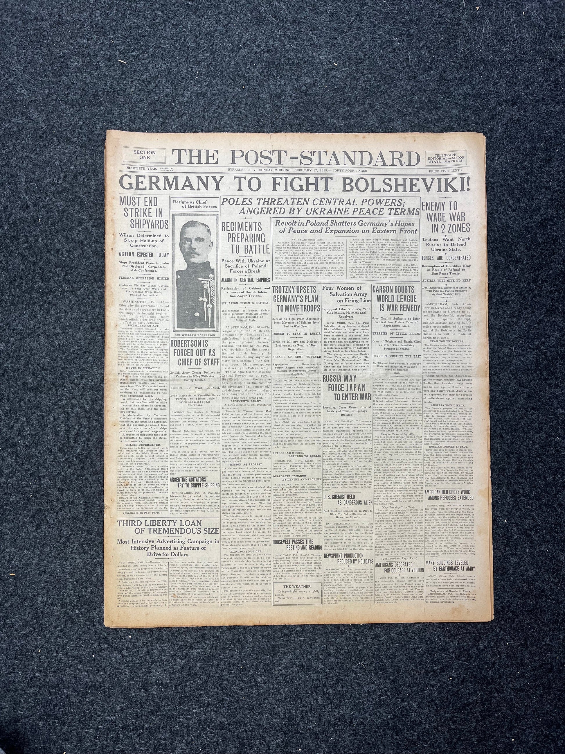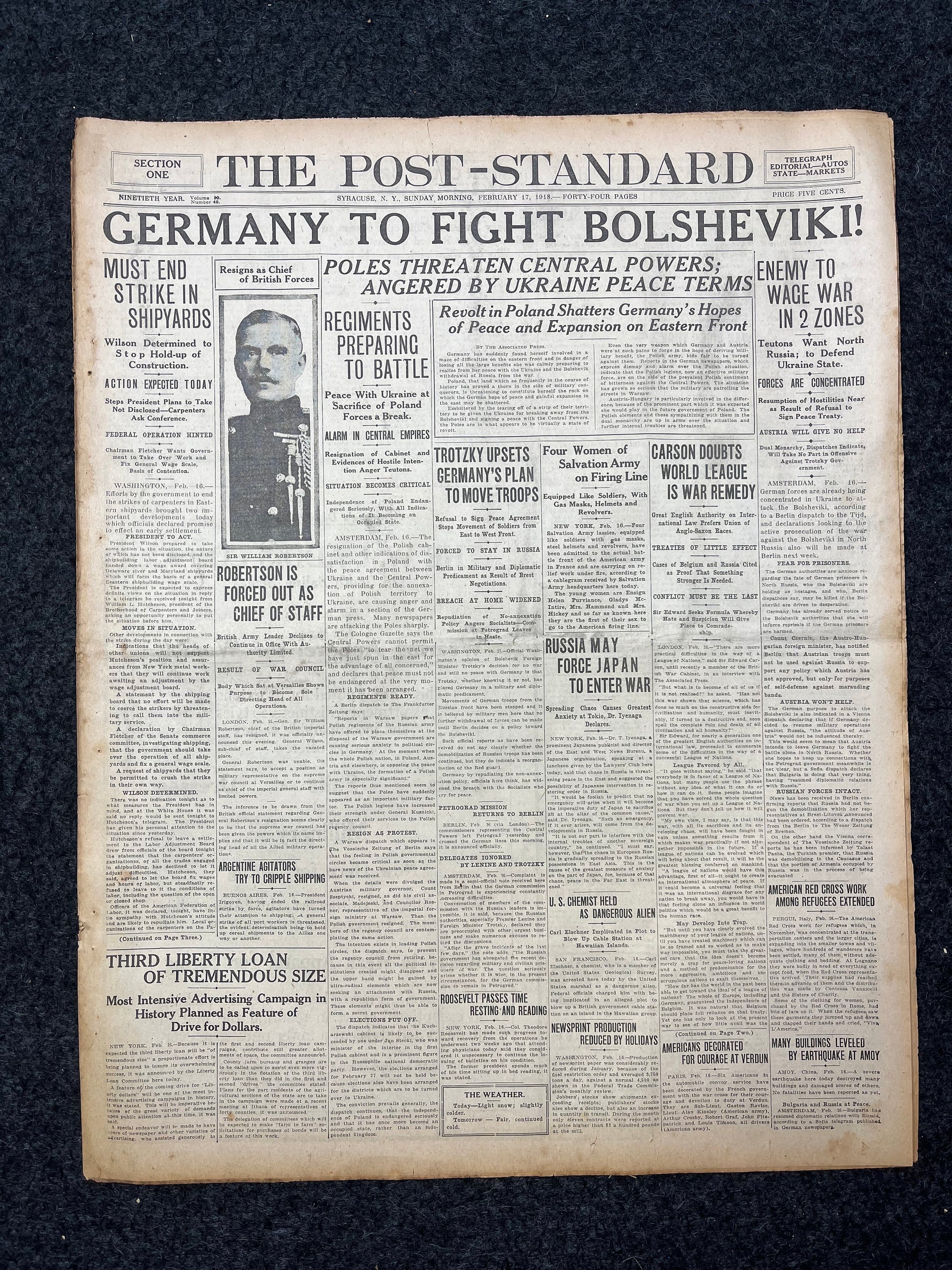 Description: Printed one month before the Treaty of Brest-Litvosk, this newspaper proclaims the central power war with Russia. This "war" would be avoided a month later with the aformentioned treaty. This is because Russia was basically in a Civil War at this point anyway.